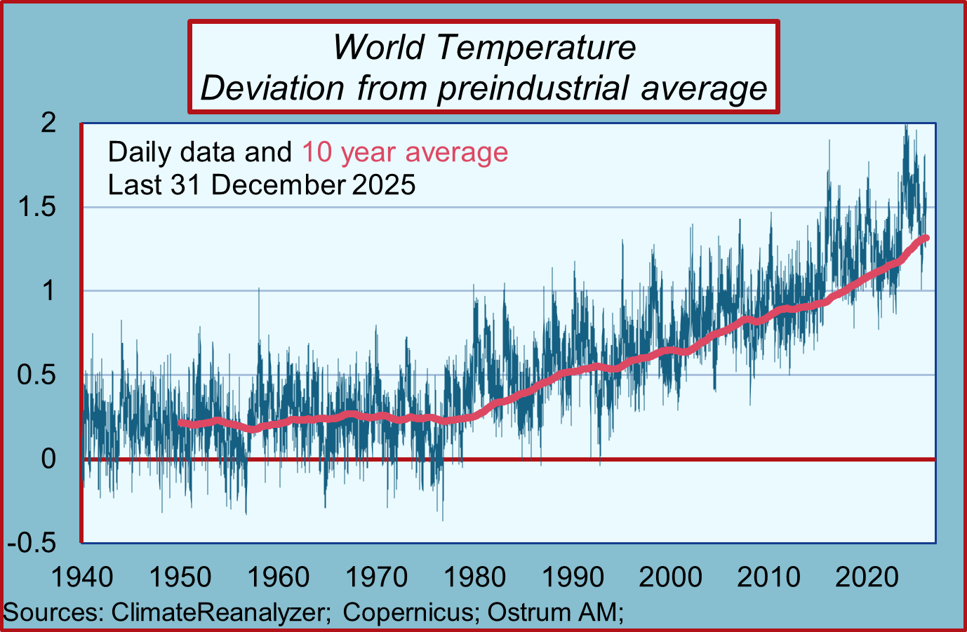 The second graph shows daily data since 1940 and the 10-year average, in red. This type of measurement is generally used for comparison with the Paris Agreement target. At the end of December, the 10-year average temperature was 1.32°C above the pre-industrial average.
