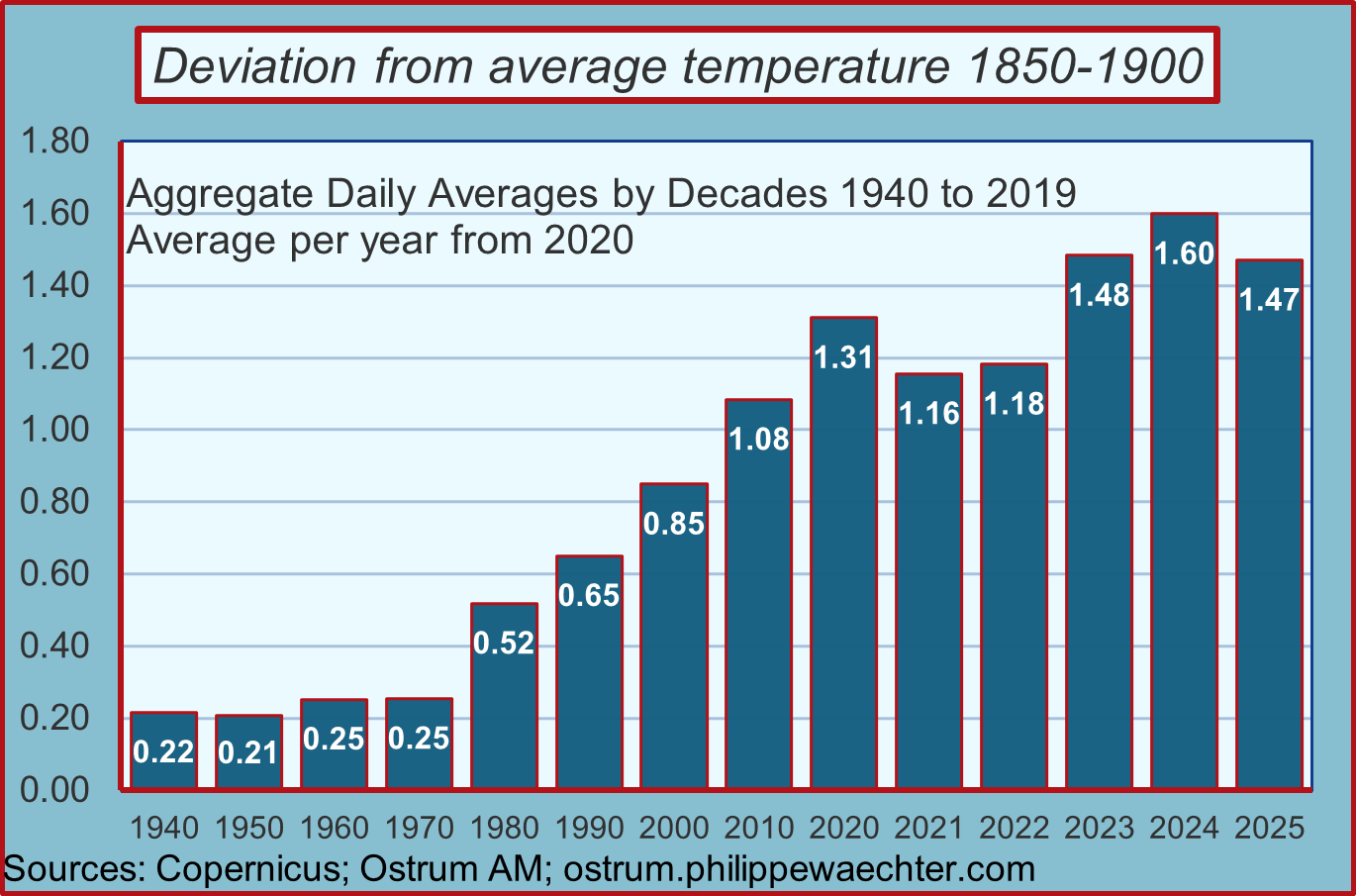 The first graph on the right shows the average annual temperature for the decades from 1940 to 2010 and for the years 2020 to 2025 which have been individualized.