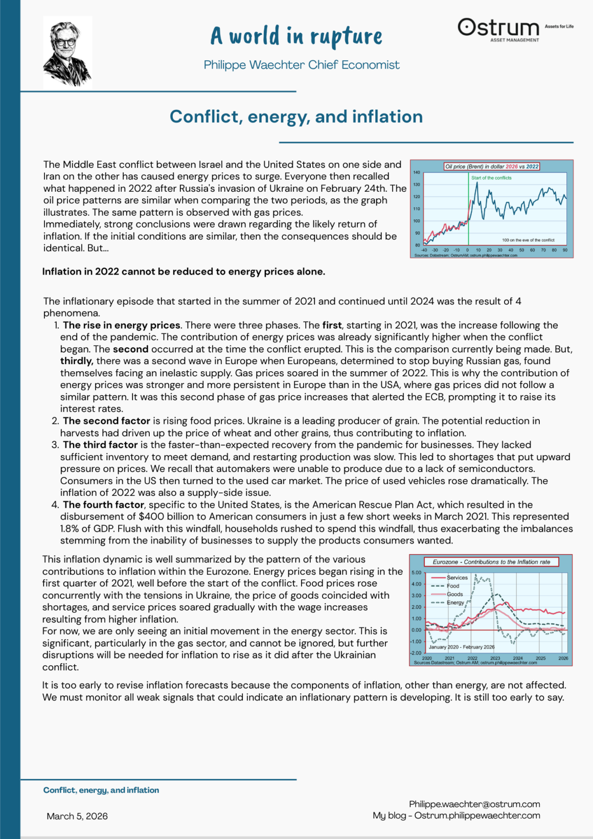 The rise in energy prices. There were three phases. The first, starting in 2021, was the increase following the end of the pandemic. The contribution of energy prices was already significantly higher when the conflict began. The second occurred at the time the conflict erupted. This is the comparison currently being made. But, thirdly, there was a second wave in Europe when Europeans, determined to stop buying Russian gas, found themselves facing an inelastic supply. Gas prices soared in the summer of 2022. This is why the contribution of energy prices was stronger and more persistent in Europe than in the USA, where gas prices did not follow a similar pattern. It was this second phase of gas price increases that alerted the ECB, prompting it to raise its interest rates.