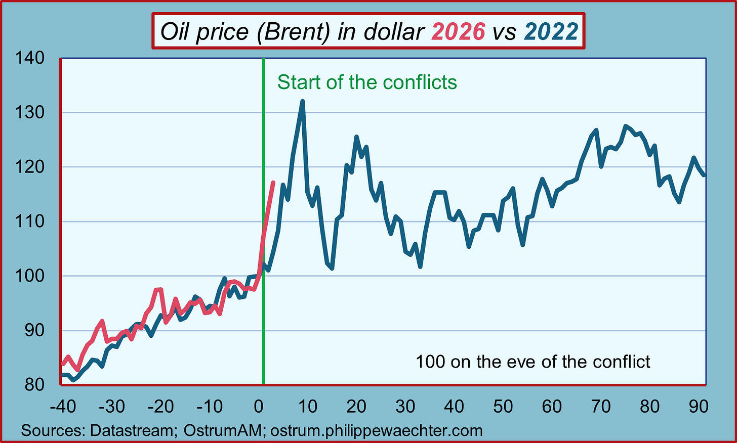 The Middle East conflict between Israel and the United States on one side and Iran on the other has caused energy prices to surge. Everyone then recalled what happened in 2022 after Russia’s invasion of Ukraine on February 24th. The oil price patterns are similar when comparing the two periods, as the graph illustrates. The same pattern is observed with gas prices.