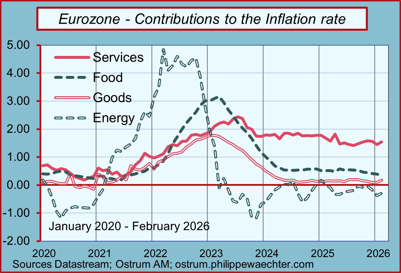 This inflation dynamic is well summarized by the pattern of the various contributions to inflation within the Eurozone. Energy prices began rising in the first quarter of 2021, well before the start of the conflict. Food prices rose concurrently with the tensions in Ukraine, the price of goods coincided with shortages, and service prices soared gradually with the wage increases resulting from higher inflation.