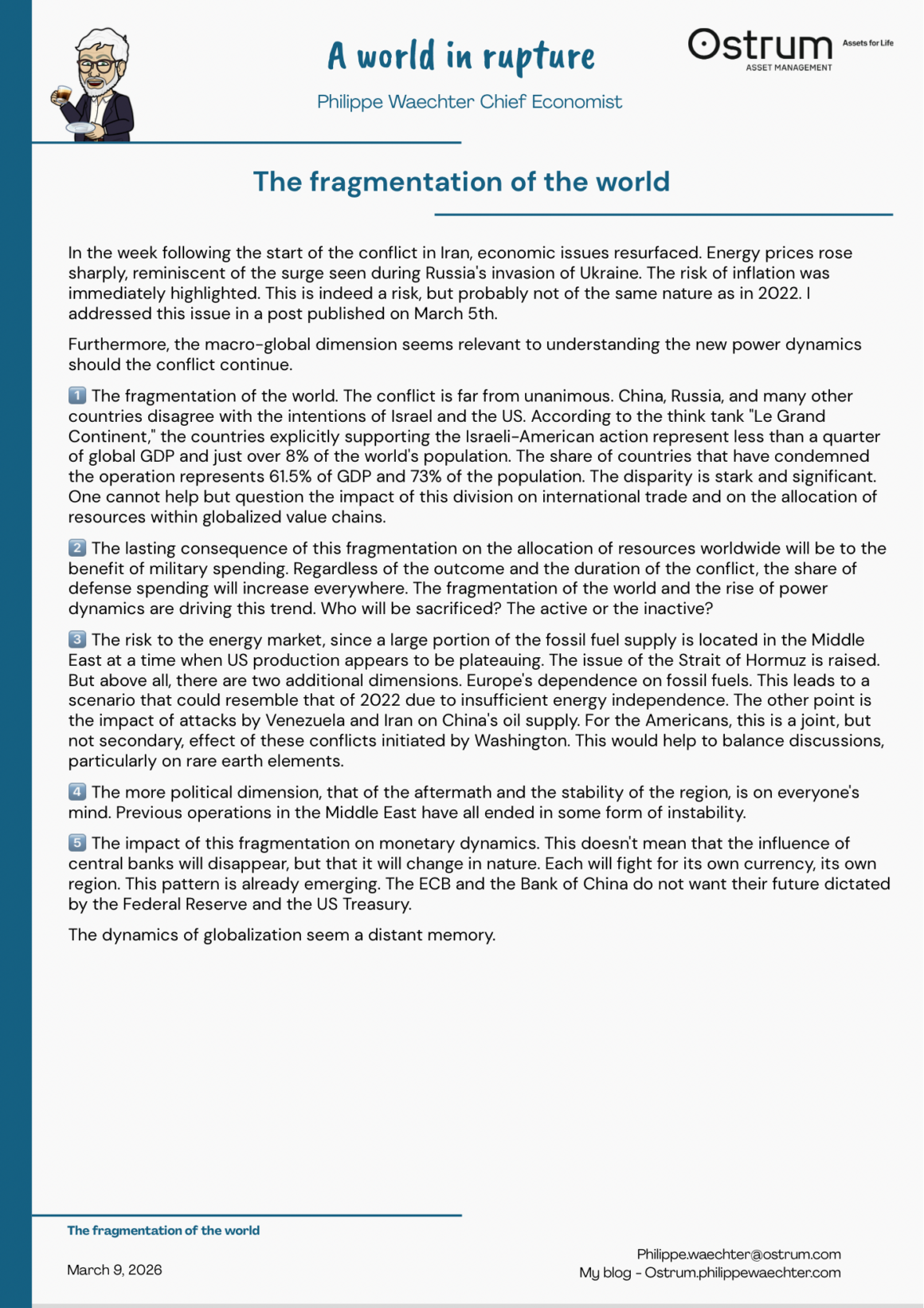 In the week following the start of the conflict in Iran, economic issues resurfaced. Energy prices rose sharply, reminiscent of the surge seen during Russia’s invasion of Ukraine. The risk of inflation was immediately highlighted. This is indeed a risk, but probably not of the same nature as in 2022. I addressed this issue in a post published on March 5th.