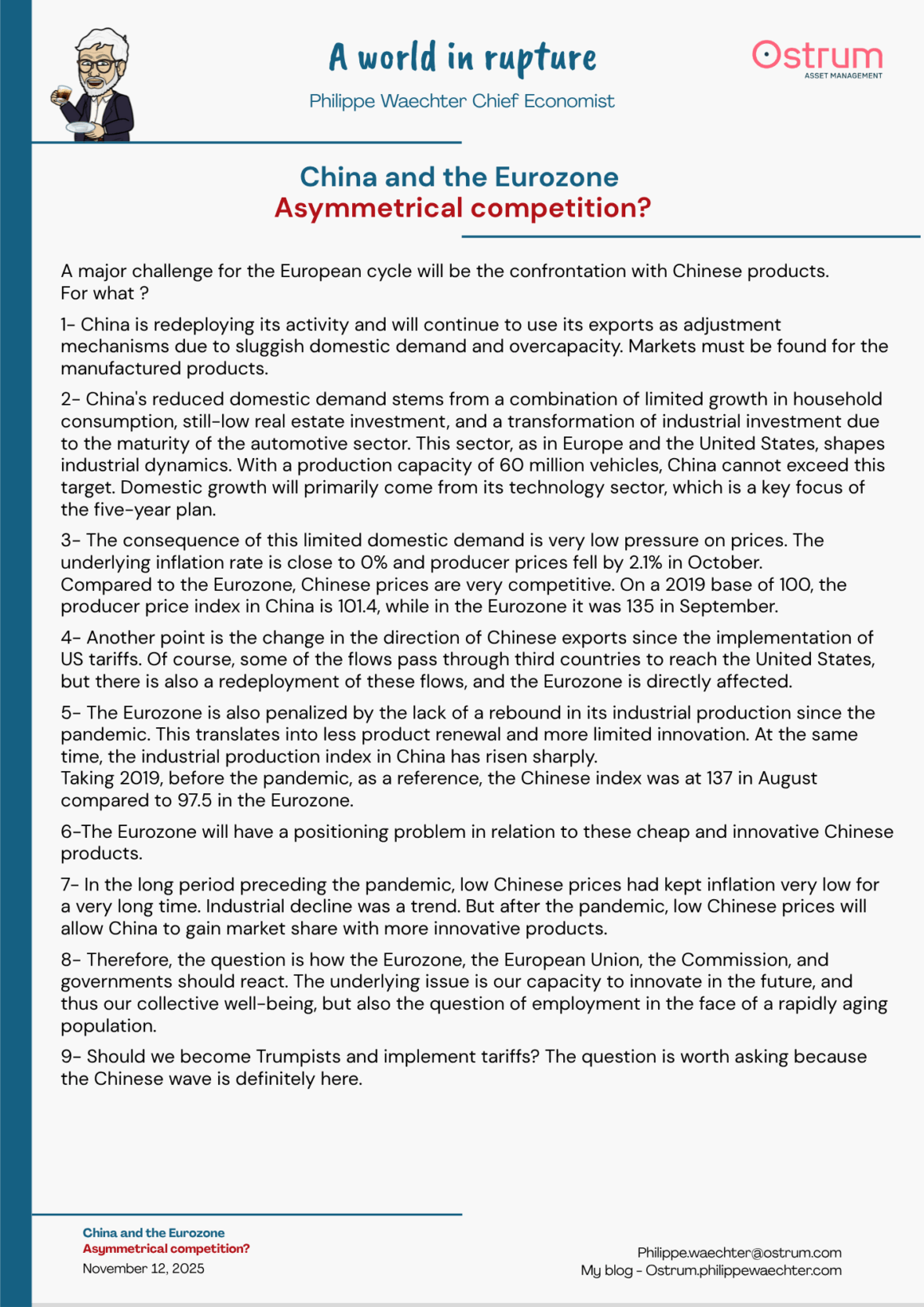 1- China is redeploying its activity and will continue to use its exports as adjustment mechanisms due to sluggish domestic demand and overcapacity. Markets must be found for the manufactured products.